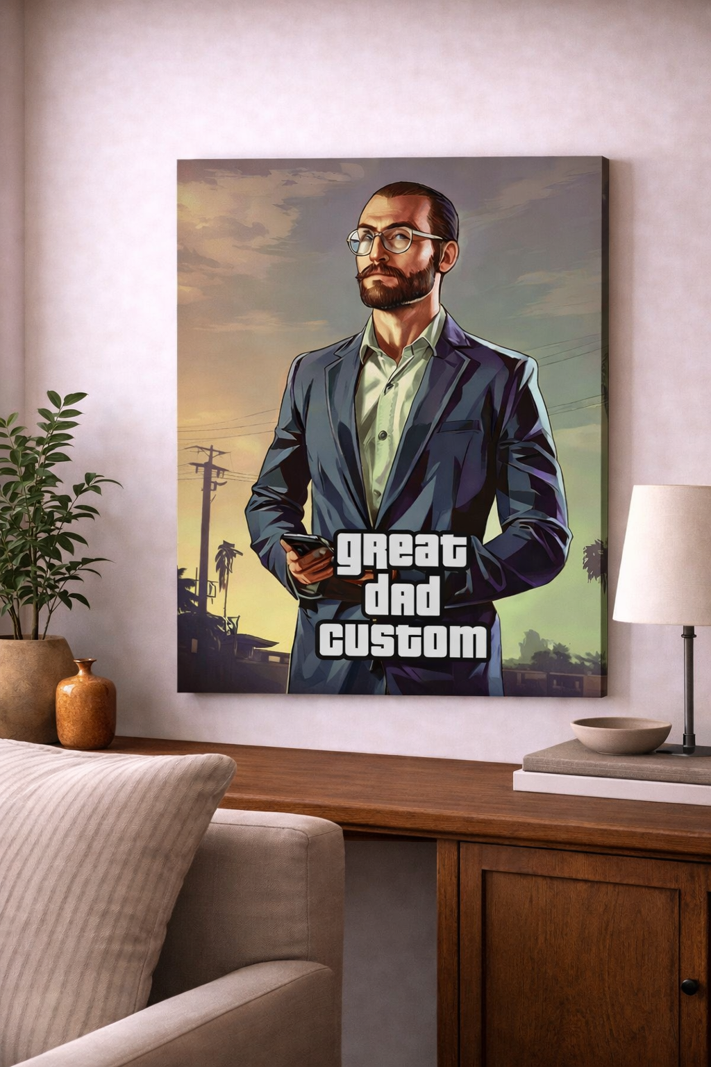 Nie zwlekaj! Zamów już dziś Personalizowany Obraz na płótnie w stylu okładki GTA V dla taty i spraw, aby każdy dzień był dla niego pełen wspomnień i uśmiechu.