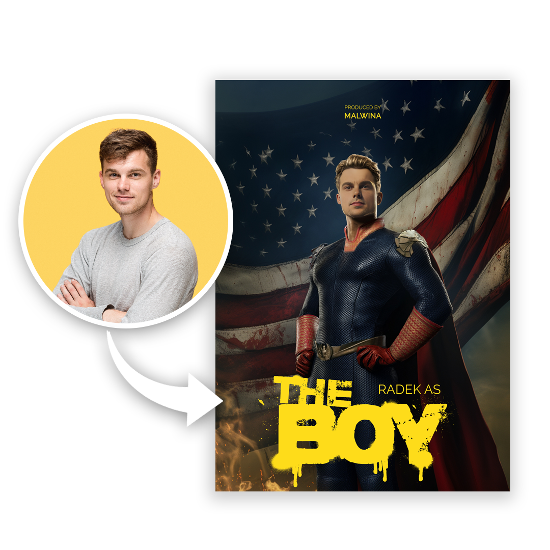 - Personalizacja: Wklejamy twarz Twojego chłopaka na ciało Homelandera, co tworzy niepowtarzalny i osobisty prezent.
