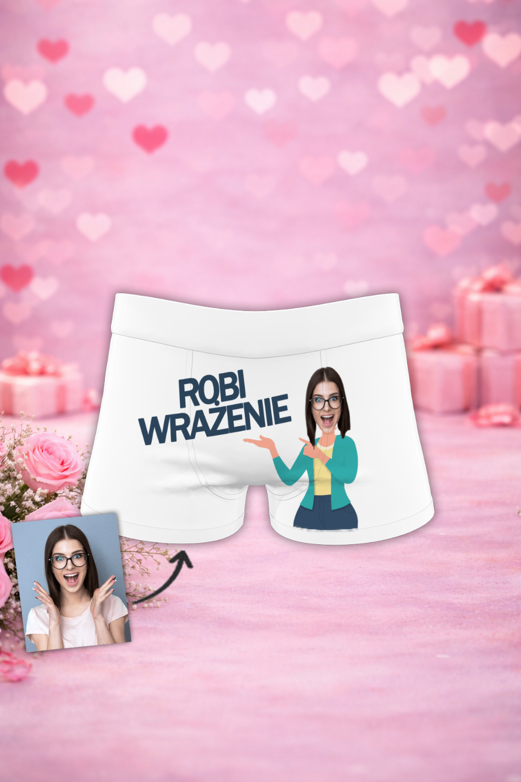 Jeśli chcesz, aby Twój prezent zrobił wrażenie, mamy dla Ciebie propozycję, która zapewni niezapomniane wrażenia! Nasze personalizowane bokserki ze zdjęciem Twojej twarzy i napisem "ROBI WRAŻENIE" to nie tylko oryginalny gest, ale także wygodny i stylowy pomysł na wyrażenie swoich uczuć.