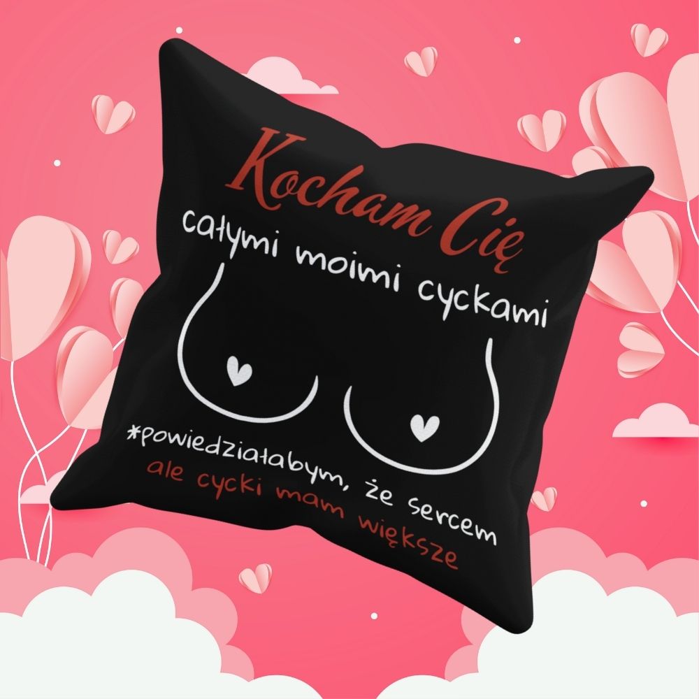 Czarna poduszka z odważnym, humorystycznym napisem „Kocham Cię całymi moimi cyckami” oraz zabawną puentą to idealny dodatek dla par z dystansem i poczuciem humoru. Minimalistyczna grafika i kontrastowy nadruk sprawiają, że poduszka przyciąga wzrok i świetnie sprawdzi się jako prezent „z przymrużeniem oka”.