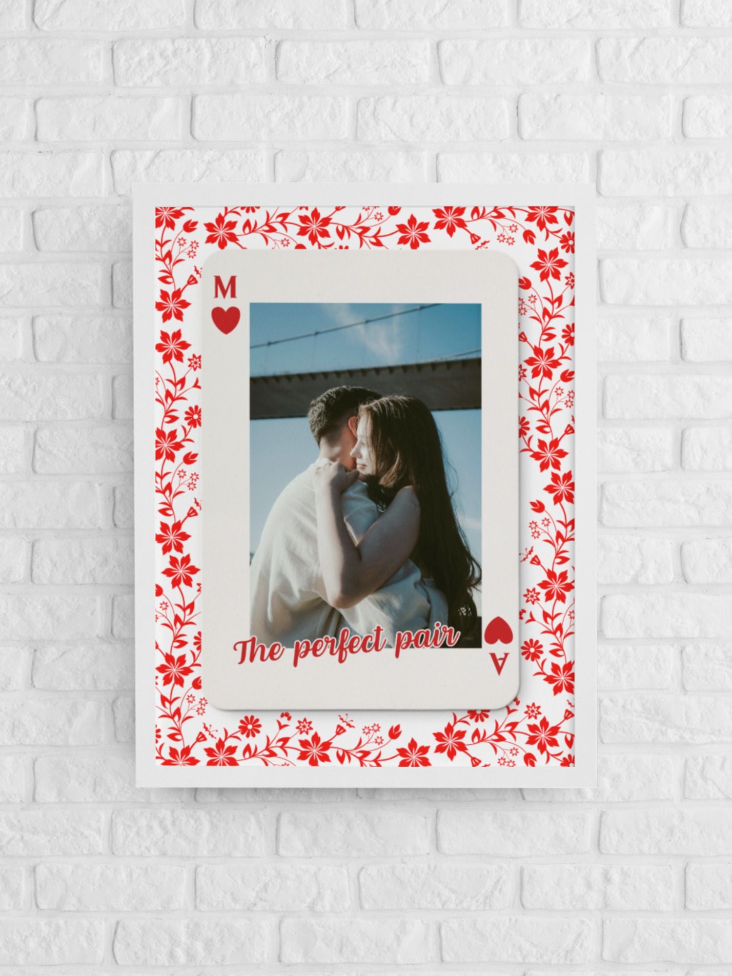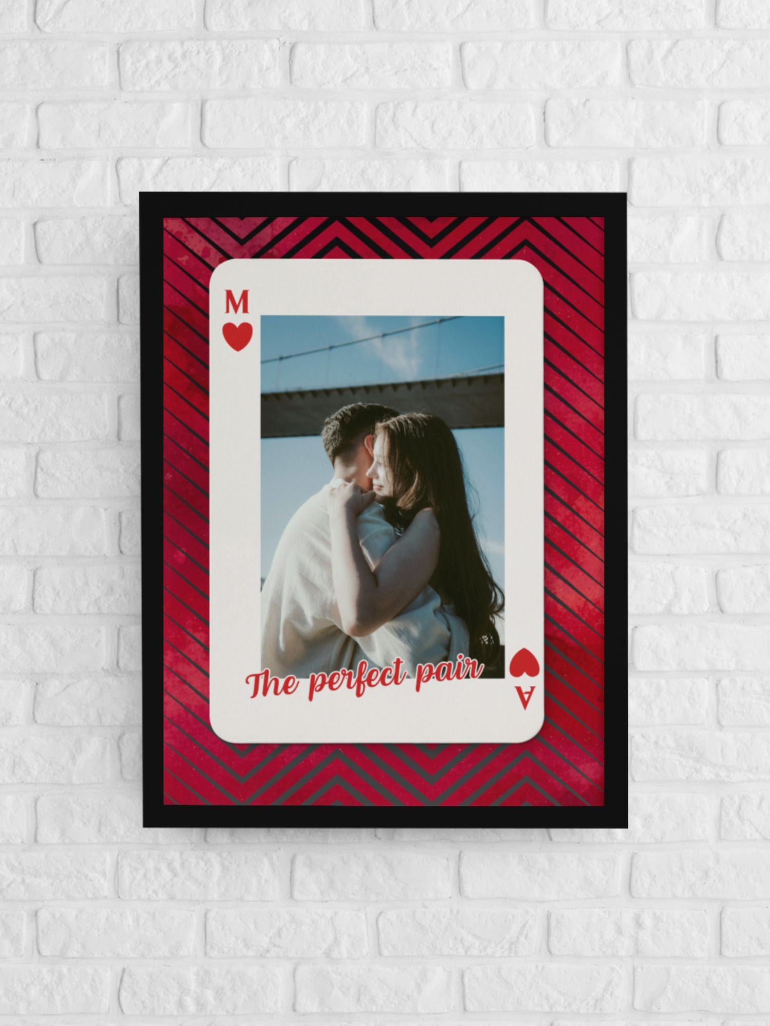 Szukasz dekoracji, która będzie jednocześnie stylowa i naprawdę „Wasza”? Ten personalizowany obraz ze zdjęciem w formie romantycznej karty z napisem „The perfect pair” to wyjątkowa pamiątka dla par. Minimalistyczny układ, kontrastowe czarno-białe tło oraz subtelne serca sprawiają, że całość wygląda nowocześnie i świetnie pasuje do sypialni, salonu czy domowej galerii wspomnień.